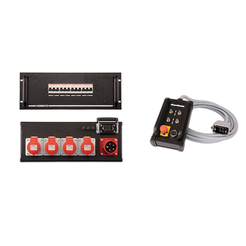 Manual Controller BGV-D8 4‑ch Remote Control with 6m Cable IN CEE-16/5, OUT 4x CEE-16/4 For chain hoist up to 1kW incl. Phase monitoring, Rotation field monitoring, Main contactor monitoring, Reversing contactor monitoring, Emergency stop contactor monitoring, Multicore Outputs as option, incl. Lifting direction display via 2-colour LED (red / green).