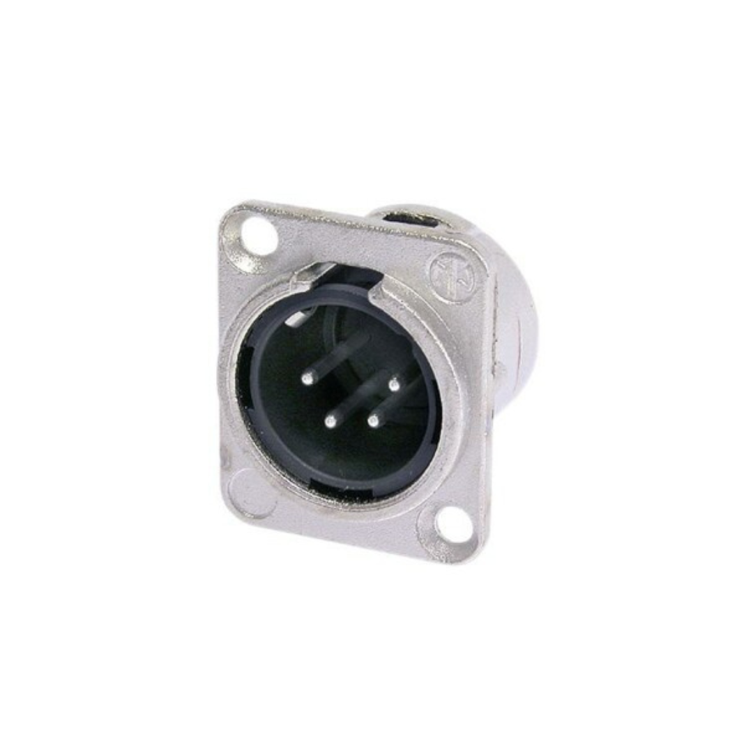 4 pole male receptacle, solder cups, Nickel housing, silver contacts. Universal D-size metal body XLR panel mount series. UL recognized component.