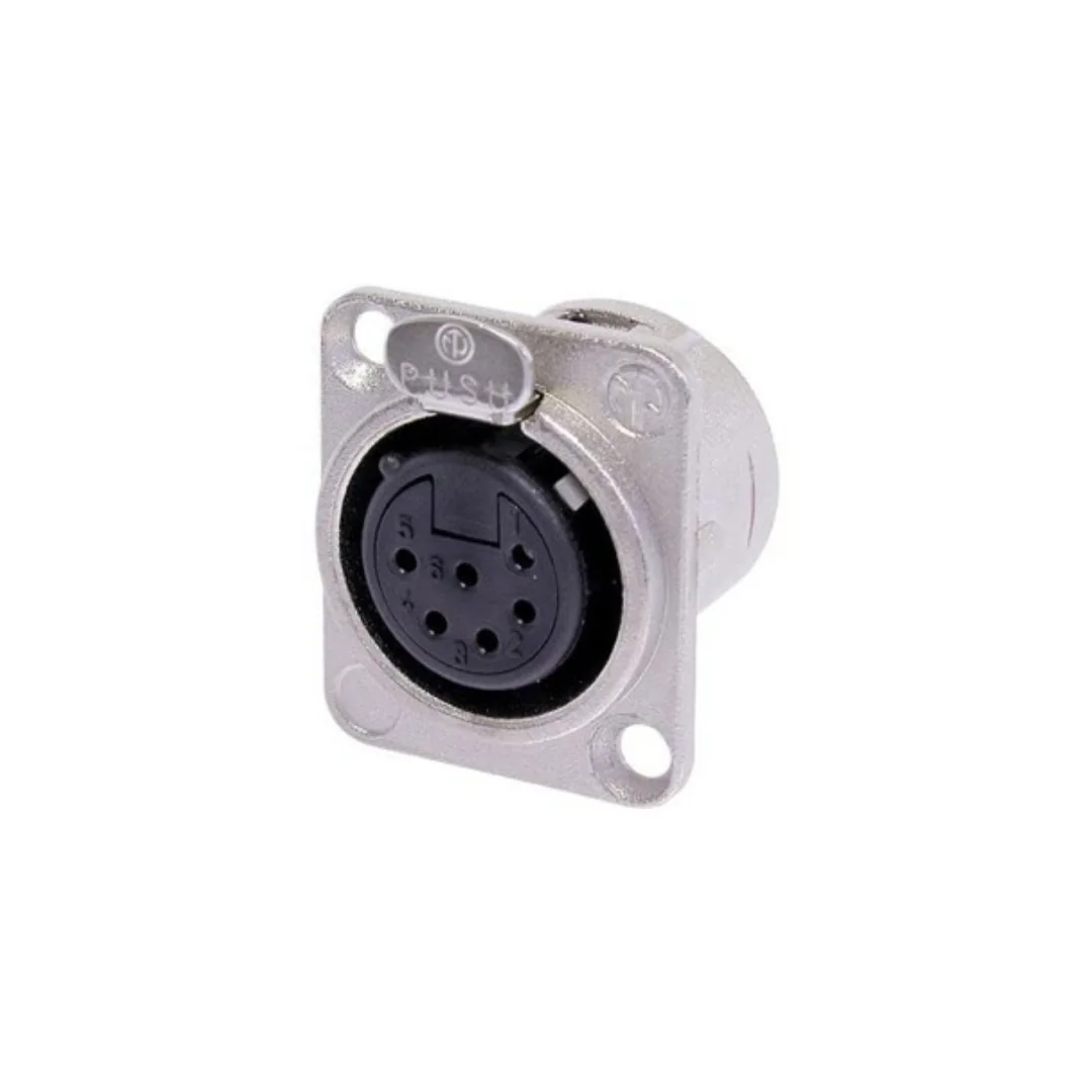 6 pole female receptacle, solder cups, Nickel housing, silver contacts. Universal D-size metal body XLR panel mount series. UL recognized component.