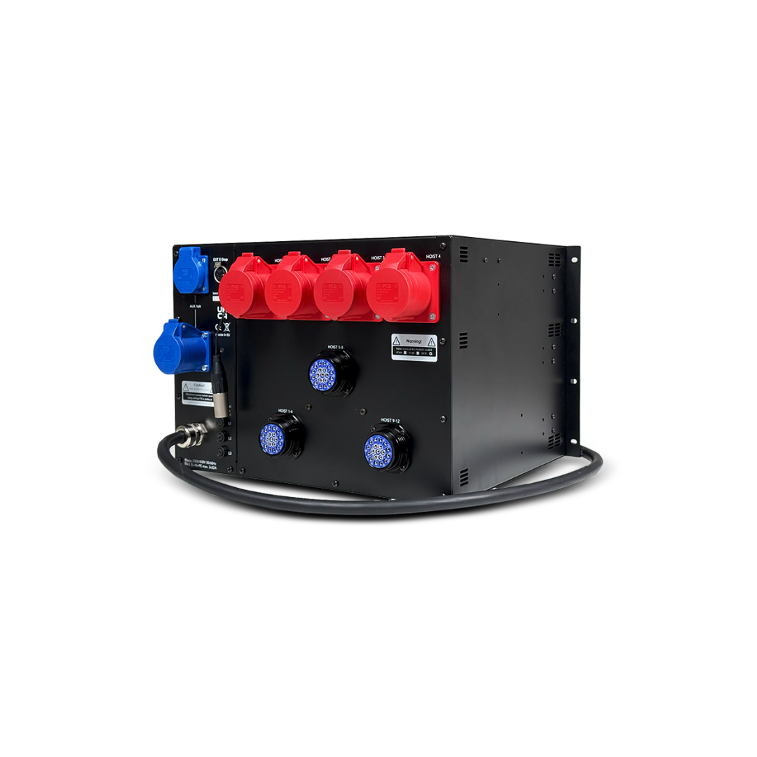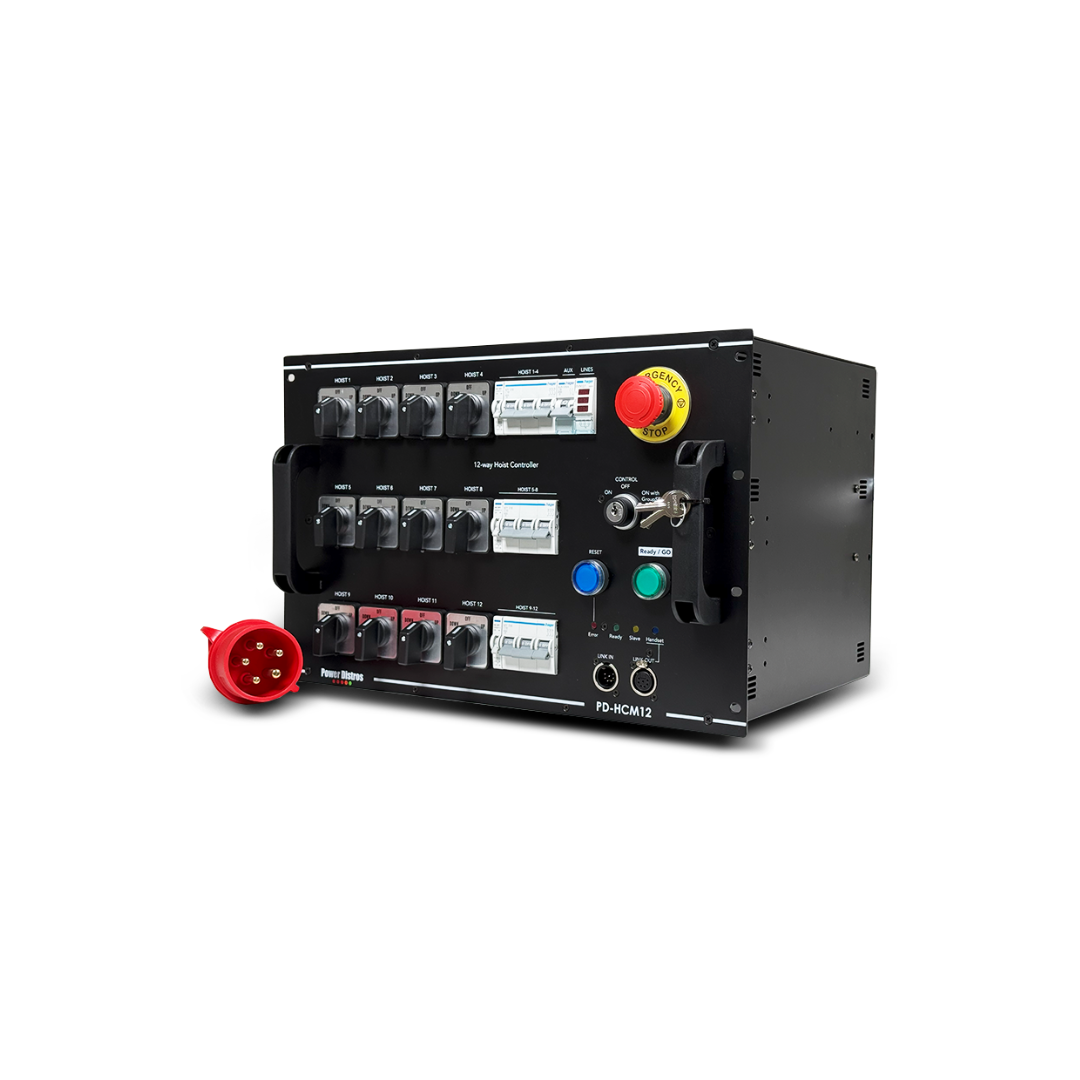 The PD-HCM12 is a high-capacity 12-channel hoist controller engineered for large-scale rigging, featuring local direction control for individual motor adjustment. It operates on a TN-S 3x230V/400VAC power supply and adheres to the Cat0 Stop function mode (EN60204-32) for maximum safety. Outputs are provided via 4x CEE16/4P connectors, with protection managed by 3P C16A breakers for each 4-motor group. Connectivity includes 7-pole XLR Link I/O for daisy-chaining and a 4-pole XLR for an External E-Stop. The unit delivers robust, safety-compliant control for up to 12 hoists.