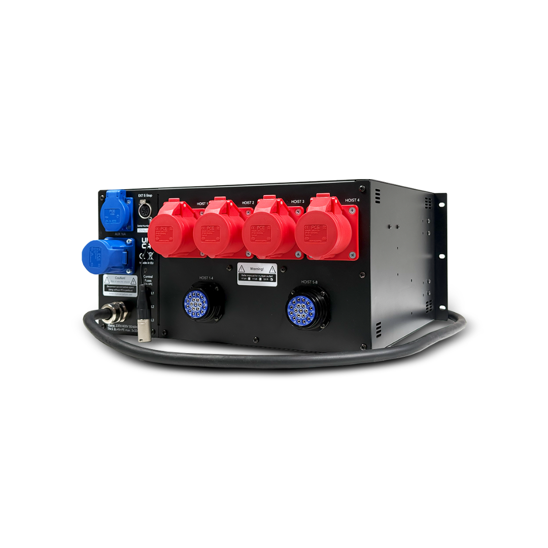 The PD-HCM8 is a professional 8-channel hoist controller providing reliable motor control with local direction control. It operates on a TN-S 3x230V/400VAC power supply and complies with Cat0 Stop function mode (EN60204-32) for high safety standards. Outputs are delivered via 4x or 8x CEE16/4P connectors. Output protection uses 3P C16A breakers for each 4-motor group. The controller features 7-pole XLR Link I/O for system linking and a 4-pole XLR for an External E-Stop signal, making it a robust and safety-conscious solution for rigging applications.